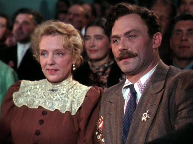 ㅤㅤㅤНа последующем снимке мы видим кадр из очередного кинематографического лубка, где изображены главные герои фильма - председатель колхоза «Заветы Ильича» Галина Ермолаевна Пересветова (Марина Ладынина) и председатель колхоза «Красный партизан» Гордей Гордеевич Ворон (Сергей Лукьянов) на выставке-ярмарке